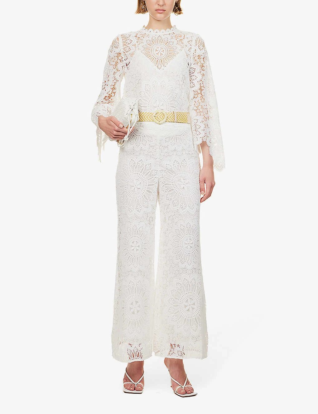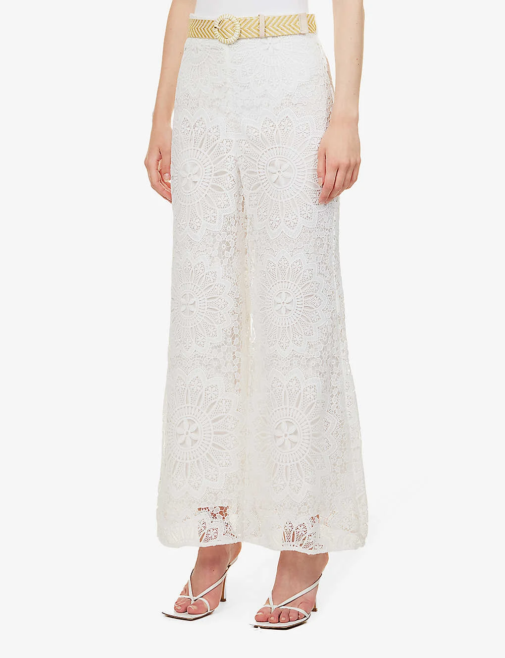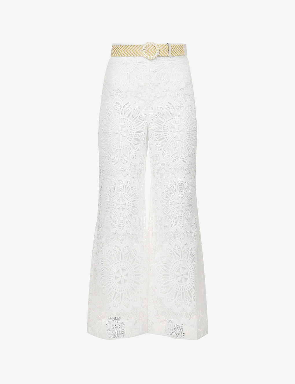 - Regular fit, mid-rise, wide leg, structured waistband, contrast woven belt, broderie pattern